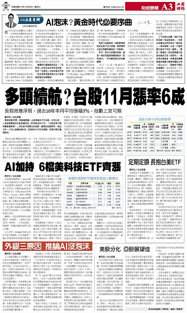 • 定期定額 長抱台美ETF 外銀:美股分化 亞股展望佳 外銀三原因 推論AI沒泡沫 AI加持 6檔美科技ETF齊漲 AI泡沫?黃金時代必要序曲 多頭續航?台股11月漲率6成