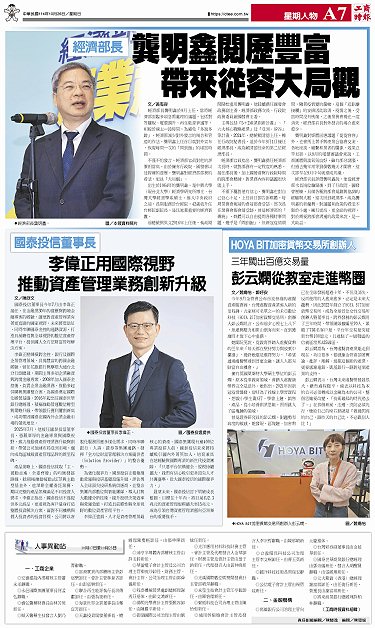 • 人事異動站 10月17日至10月23日 HOYA BIT加密貨幣交易所創辦人彭云嫻 從教室走進幣圈 三年闖出百億交易量 國泰投信董事長李偉正用國際視野 推動資產管理業務創新升級 經濟部長龔明鑫閱歷豐富 帶來從容大局觀