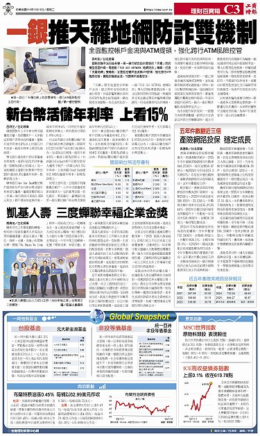 • 大額換匯高利定存 銀行搶客 川普對等關稅若被喊卡 中國與印度短期受惠大 未具證基金等商品 擬放寬購買人數 玉山銀推保費、保單融資服務 助益高資產客群傳承 彰銀主辦格珞麗亞企業40億聯貸 挺華泰名品城南進嘉義 10億級富豪 2029增至1.1萬人