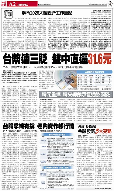 • 韓元重摔 韓央總裁示警通膨風險 解析2026大陸經濟工作重點 外資12月狂敲 金融股寫五大亮點 台股季線有撐 迎內資作帳行情 台幣連三貶 盤中直逼31.6元