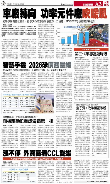 • SiC產業2027迎拐點 第三代半導體鏈嗨爆 墨西哥擬對台加徵關稅… 童子賢:政策相互矛盾 手機恐漲價衝擊出貨… 面板驅動IC業成海嘯第一排 漲不停 外資高看CCL雙雄 智慧手機 2026恐價漲量縮 車廠轉向 功率元件廠吹暖風