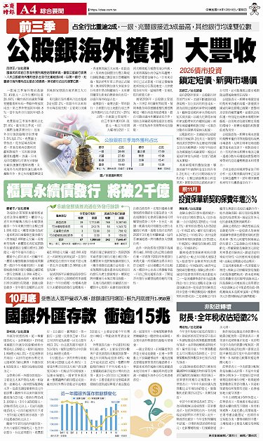 • 前11月投資保單新契約保費年增28% 2026債市投資》鎖定短債、新興市場債 非財政轉壞 財長:全年稅收估短徵2% 櫃買永續債發行 將破2千億 10月底國銀外匯存款 衝逾15兆 前三季公股銀海外獲利 大豐收