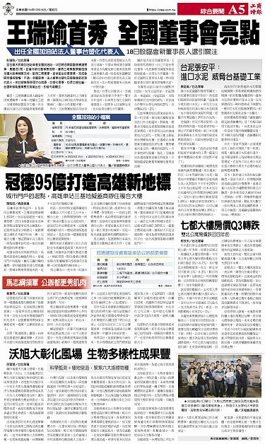 • 七都大樓房價Q3轉跌 雙北公寓房價跌回四年前 馬志綱領軍 冠德建設公辦都更秀肌肉 台泥張安平:進口水泥 威脅台基礎工業 冠德95億打造高雄新地標 沃旭大彰化風場 生物多樣性成果豐 王瑞瑜首秀 全國董事會亮點