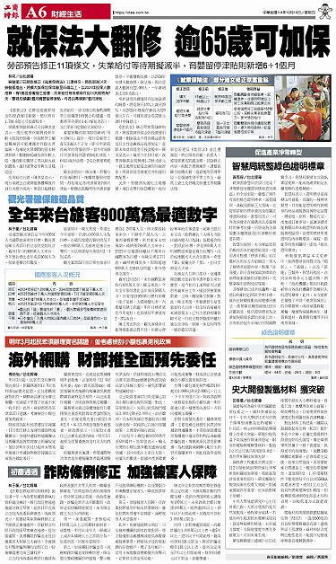 • 央大開發製氫材料 獲突破 詐防條例修正初審通過 加強被害人保障 智慧局統整綠色證明標章 海外網購 財部推全面預先委任 全年來台旅客900萬為最適數字 就保法大翻修 逾65歲可加保