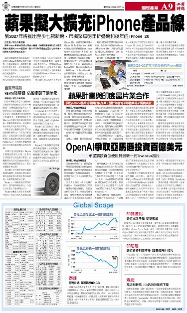 • 蘋果計畫與印度晶片業合作 自駕市場熱 Waymo談募資 估值衝破千億美元 OpenAI爭取亞馬遜投資百億美元 蘋果擬大擴充iPhone產品線 Global Scope