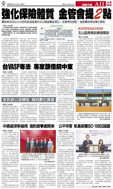 • 家族辦公室轉型 擁抱數位資產 台VASP專法 專家籲借鏡中東 邀日冠軍隊監督分享經驗 玉山盃青棒訓練營開訓 中信銀深耕越南 海防辦事處開業 公平待客 凱基銀獲ISO 10002認證 強化保險體質 金管會提2點