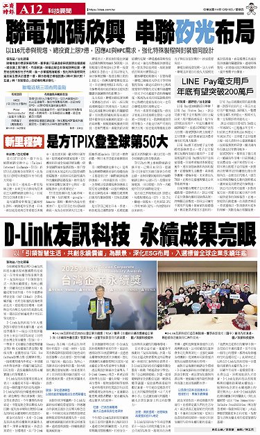 • LINE Pay電支用戶 年底有望突破200萬戶 新里程碑 是方TPIX登全球第50大 聯電加碼欣興 串聯矽光布局 D-Link友訊科技 永續成果亮眼
