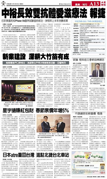 • AD 不銹鋼明年新盤價 看漲 日本atre重回台灣 進駐北捷台北車站 御嵿 明年前三季新品牌展店 星宇搶賺紅包財 春節票價年增5% 新業建設 深耕大竹苗有成 中裕長效雙抗體愛滋療法 報捷