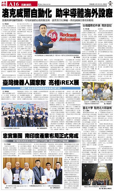 • 台灣國際扣件展 開放登記 臺北大學 點亮北大耶誕城 臺灣機器人國家隊 亮相iREX展 忠實集團 南印度產業布局正式完成 洛克威爾自動化 助半導體海外設廠