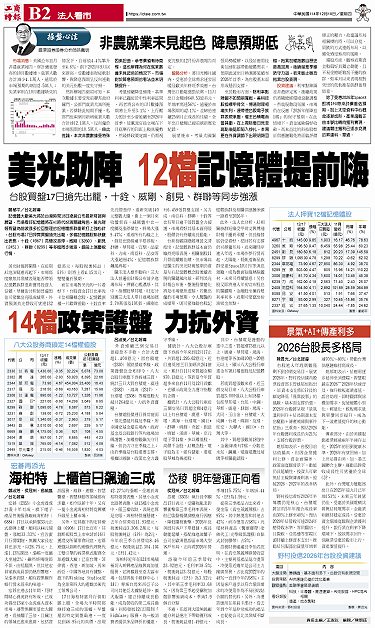 • 岱稜 明年營運正向看 宏碁再添光 海柏特 上櫃首日飆逾三成 景氣+AI+傳產利多 2026台股長多格局 14檔政策護盤 力抗外資 非農就業未見起色 降息預期低 美光助陣 12檔記憶體提前嗨