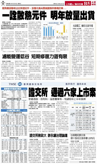 • 台積電鉅額交易 爆十張成交漲停價1,575元 證交所揪政大 辦永續治理論壇 光譜電工 續攻北美市場 濾能營運低谷 短期修復力道有限 證券集中市場成交概況、上市熱門股大排行 證交所 通過六家上市案 一詮散熱元件 明年放量出貨