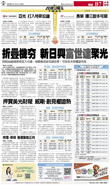 • 券商近期活動訊息專欄 AD1 AD2 長榮 賺三股本可期 南電、華城 營運動能正向 押寶美光財報 威剛、創見權證熱 熱門權證快報 亞光 打入特斯拉鏈 折疊機夯 新日興、富世達聚光