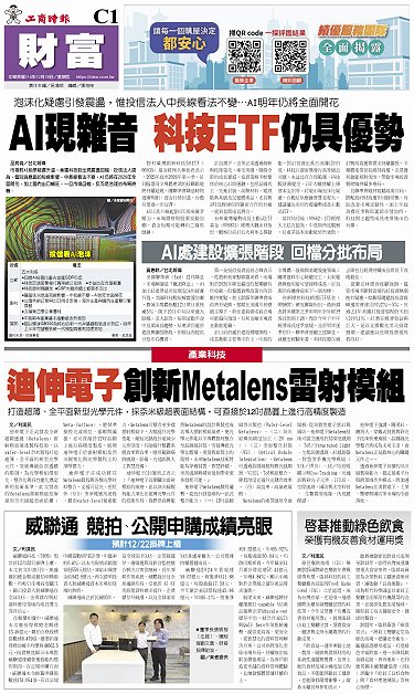 • 啟碁推動綠色飲食 榮獲有機友善食材運用獎 AI處建設擴張階段 回檔分批布局 威聯通 競拍、公開申購成績亮眼 迪伸電子創新Metalens雷射模組 AI現雜音 科技ETF仍具優勢