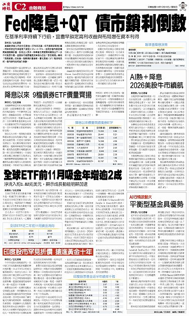 • AI行情波動大 平衡型基金具優勢 AI熱+降息 2026美股牛市續航 印度股市罕見折價 搶進黃金十年 降息以來 9檔債券ETF價量齊揚 全球ETF前11月吸金年增逾2成 Fed降息+QT 債市鎖利倒數