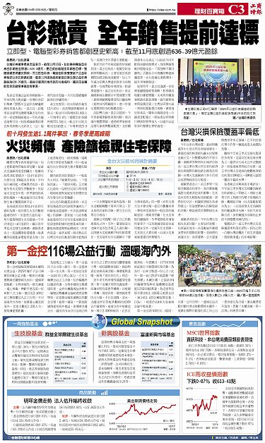 • 台灣災損保險覆蓋率偏低 第一金控116場公益行動 溫暖海內外 火災頻傳 產險籲檢視住宅保障 台彩熱賣 全年銷售提前達標 Global Snapshot