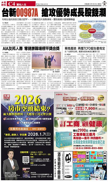 • 華南產險 再獲TCFD報告書肯定 AIA友邦人壽 奪健康職場標竿獎金獎 台新00987A 搶攻優勢成長股錢潮