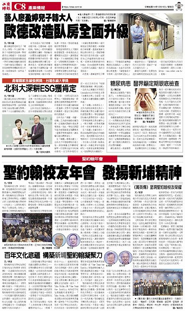 • 糖尿病患 醫界籲定期眼底檢查 《菁英傳》呈現聖約翰校友榮耀 百年文化底蘊 構築新埔聖約翰凝聚力 北科大深耕ESG獲肯定 藝人廖盈婷兒子轉大人 歐德改造臥房全面升級 聖約翰校友年會 發揚新埔精神