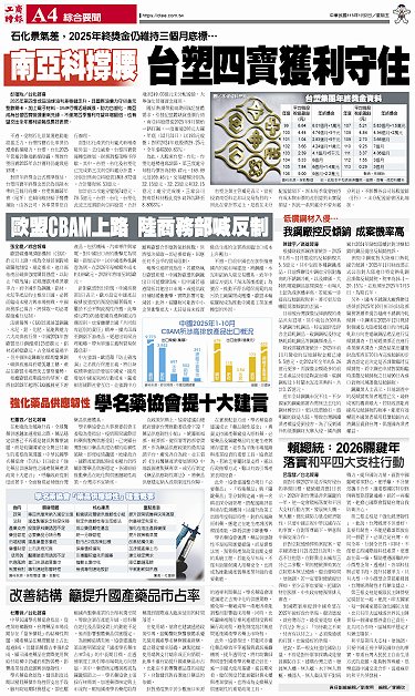 • 萬海、陽明年終獎金 農曆年前後揭曉 產品遭財部列反傾銷稅 適用碳費打2折 台經院製造業景氣 續亮黃藍燈 中古屋交易小回溫 降價成共識 分散市場 紡纖廠拓日本新藍海 航運獲利王 長榮海運年終10個月 代銷雙雄2026展望 勝2025