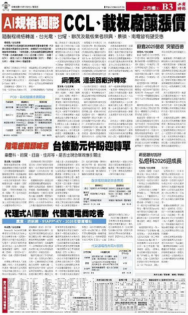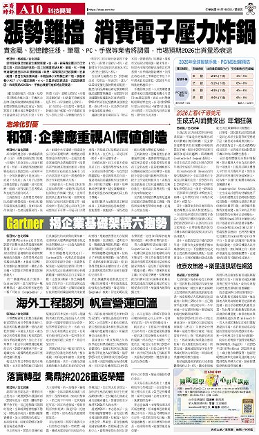 • 展現全民智慧生活圈 國科會TTA將赴CES參展 國巨 首設共同營運長制 iPhone 18系列鏡頭 大立光有望獨家供應 黃仁勳談AI 晶片解熱是突破算力關鍵 陸企下大單 輝達急洽台積 增產H200晶片 記憶體飆 PC品牌廠漲聲起