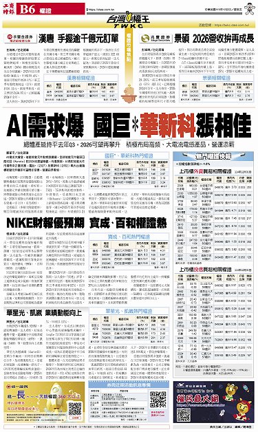 • 群創 11月每股虧損0.02元 由田 外資回補量價齊揚 漢科 多方強攻追平前高 敦陽科 11月每股稅前賺0.59元 VAS需求旺 光洋科營運看好 雙引擎啟動 榮惠2026動能強勁 上市櫃熱門股大排行 押寶3奈米 世芯狂掃台積光罩