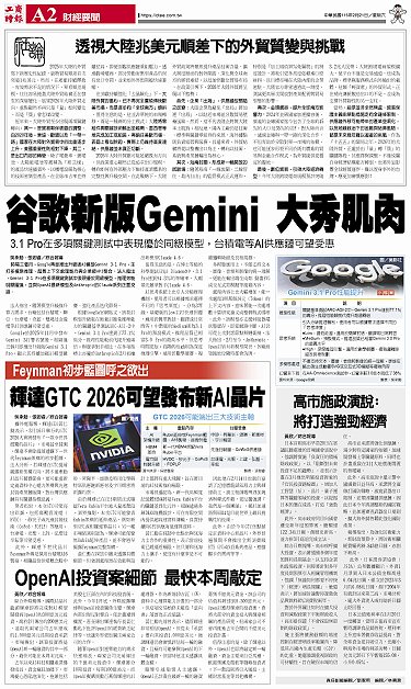• OpenAI投資案細節 最快本周敲定 高市施政演說:將打造強勁經濟 輝達GTC 2026可望發布新AI晶片 透視大陸兆美元順差下的外貿質變與挑戰 谷歌新版Gemini 大秀肌肉
