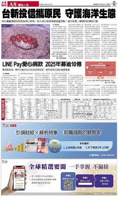 • 國內商品市場行情看板 LINE Pay愛心捐款 2025年募逾10億 台新投信攜原民 守護海洋生態