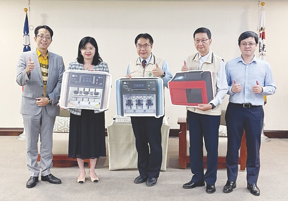 ●圓點奈米宣布,捐贈三台檢體萃取儀器給台南市政府防治登革熱;台灣圓點奈米總經理簡建興(左起)、董事長章季芸、台南市市長黃偉哲、台南市衛生局局長蘇世斌、銓敘部部長室主任蘇緯政。圖/圓點奈米提供