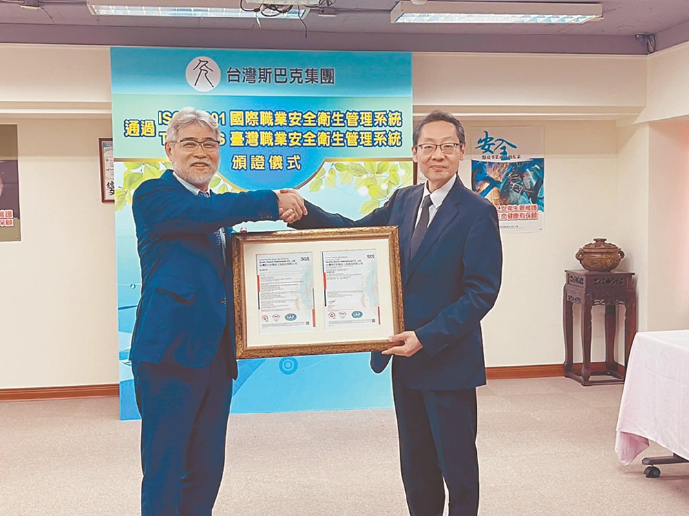 ●全台業界首家,斯巴克集團取得國際職安衛生管理系統驗證「ISO 45001暨TOSHMS職業安全衛生管理系統驗證」,8月14日由台灣檢驗科技股份有限公司(SGS)副總經理鮑伯宇(右)頒證於斯巴克集團董事長林錦堂(左)。圖/李翊榛