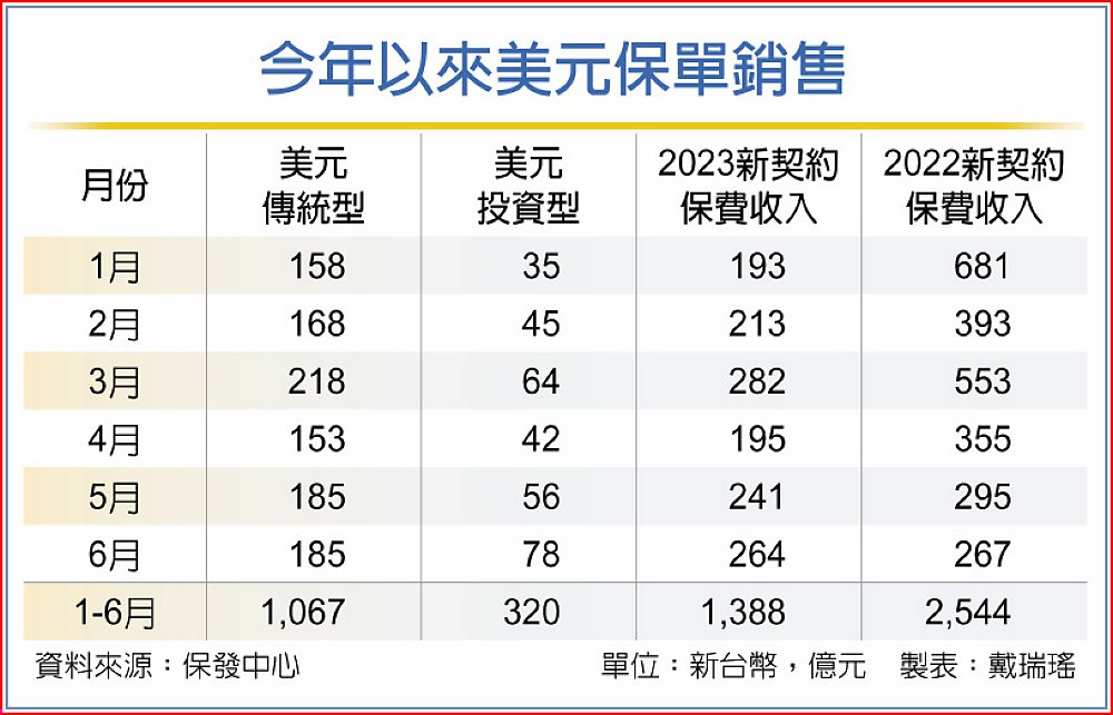 美元保單6月銷售264億元,為上半年單月第二高,最高是3月的282億元,但前六個月單月銷售皆未超過300億元,去年前六個月有兩個月銷售在500億元以上,最高是1月的681億元。