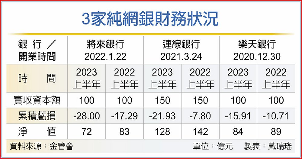 據金管會統計,截至6月底將來銀行虧損28億元,比去年同期虧損17.3億元增加62%;連線銀行虧損21.9億元,較去年上半年虧損7.8億元大增1.8倍;樂天銀行上半年虧損15.9億元,也較去年上半年虧損10.7億元增加49%。