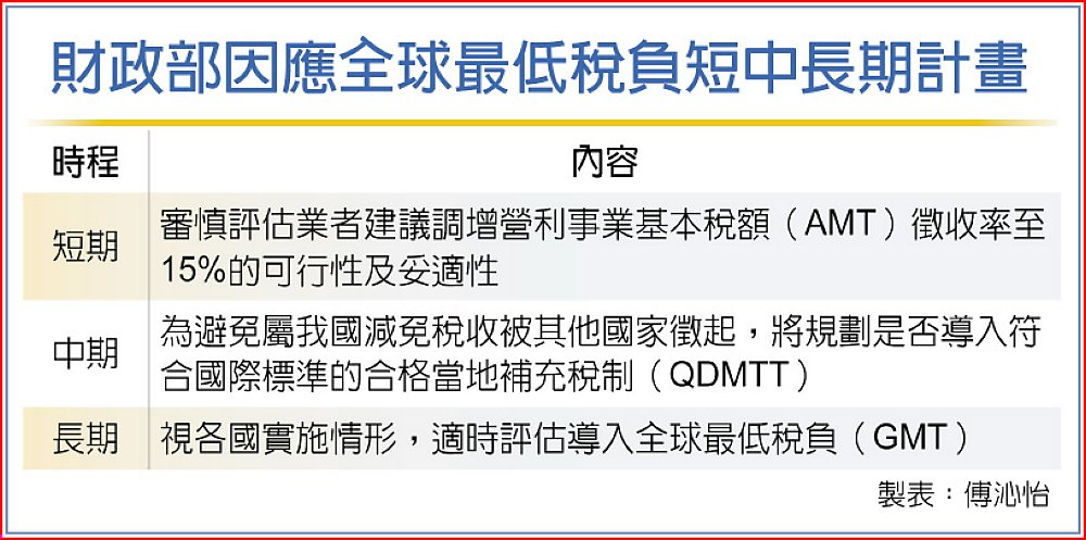 財政部進一步說明短中長期因應方式,短期將審慎評估調高營利事業基本稅額至15%的可行性及妥適性;中期規畫導入QDMTT;長期則將視各國實施情形適時評估導入全球企業最低稅負制(GMT)。