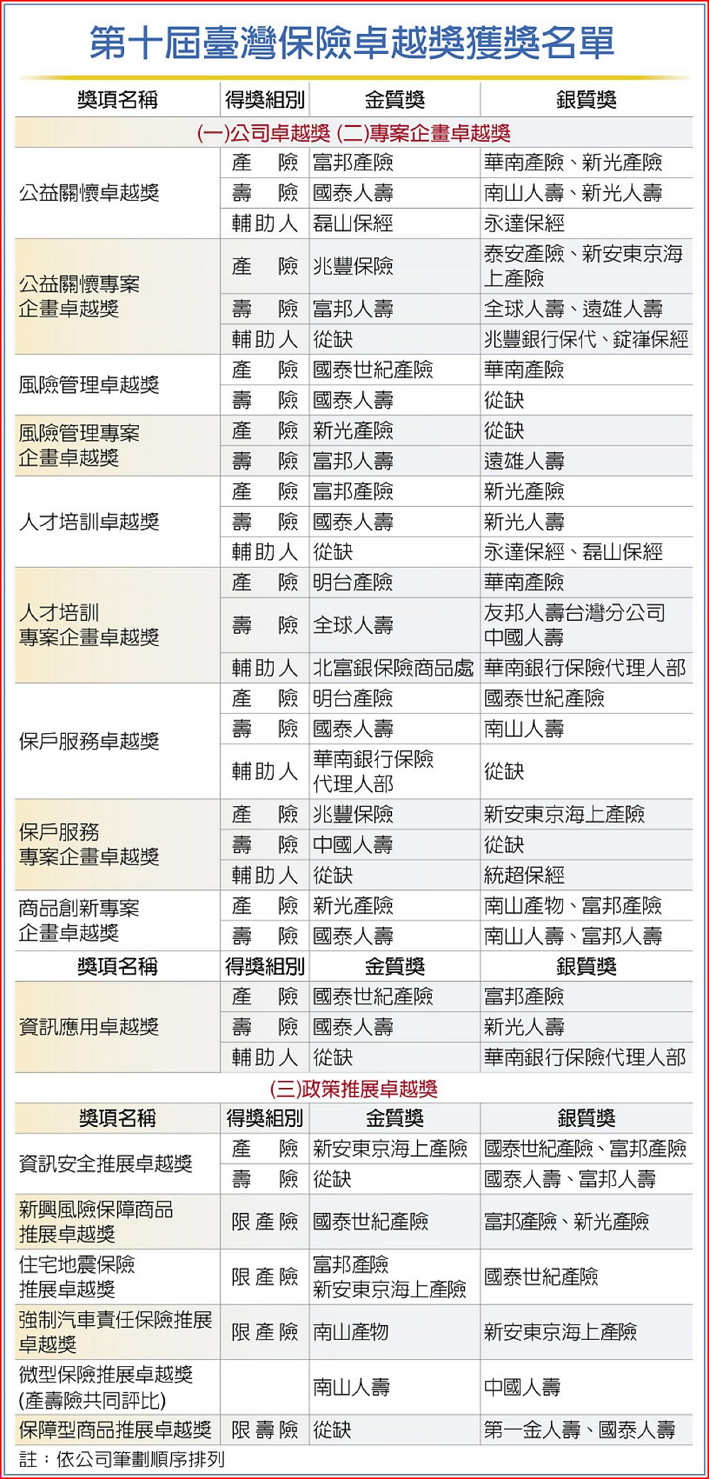 團體獎項則彰顯保險業者在公益關懷、社會企業責任、客戶服務、風險管理、人才培育、資訊安全等各個面向的成果,並設有各項政策推展卓越獎,鼓勵保險公司協助政府建立完整的社會保險保障防護網。