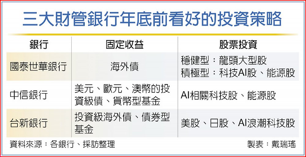 股票部分,台新銀表示,可以美股為資產配置首選,建議投資人可留意搭上AI浪潮的科技、受惠於日圓貶值的日本,及年終消費旺季題材的消費股等機會市場,透過股票型基金掌握機會同時分散風險。中信銀也認為,股市除留意評價面修正外,AI議題仍為長期趨勢,可透過定期定額、分批布局方式參與軟硬體、雲端運算、資訊安全等題材,另可關注具股利成長特性的能源股,掌握輪動機會。