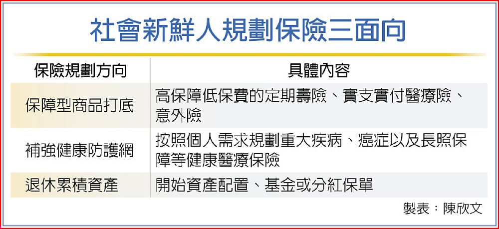 二是已有意外險及定期壽險的社會新鮮人,如資金有餘裕,建議要檢視過往家中疾病史,再按照個人需求規劃重大疾病、癌症以及長照保障等健康醫療保險,補強健康防護,照顧好自己才能安心打拚事業。