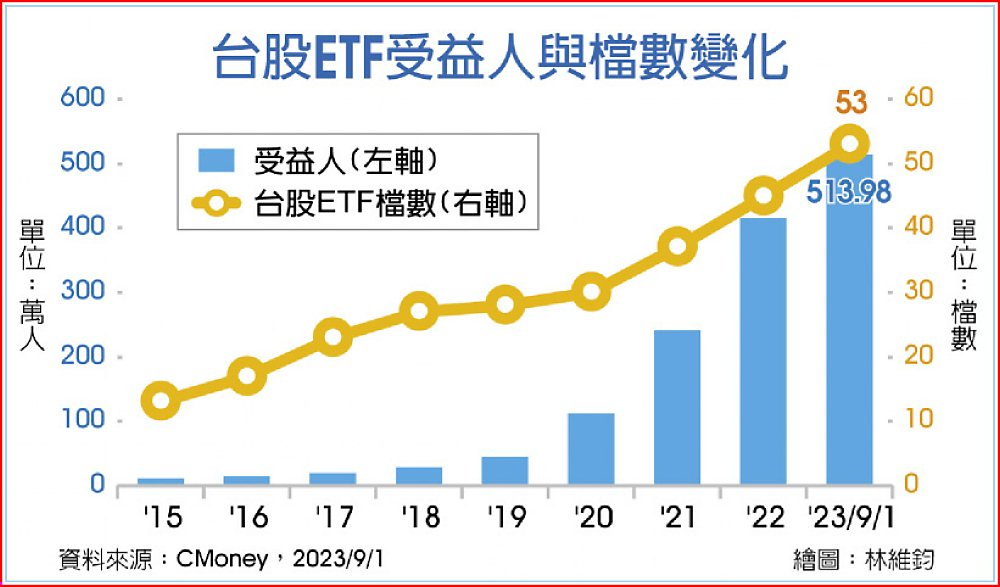 台股ETF基金受益人數在2020年底突破百萬,達112.8萬人,2021年底翻倍至241萬人,去年大幅成長至415.6萬,全年增加174萬人,創單年增加新高;今年8月突破500萬人次大關後,仍持續成長,本周將挑戰受益人數今年累計增加逾百萬人大關。