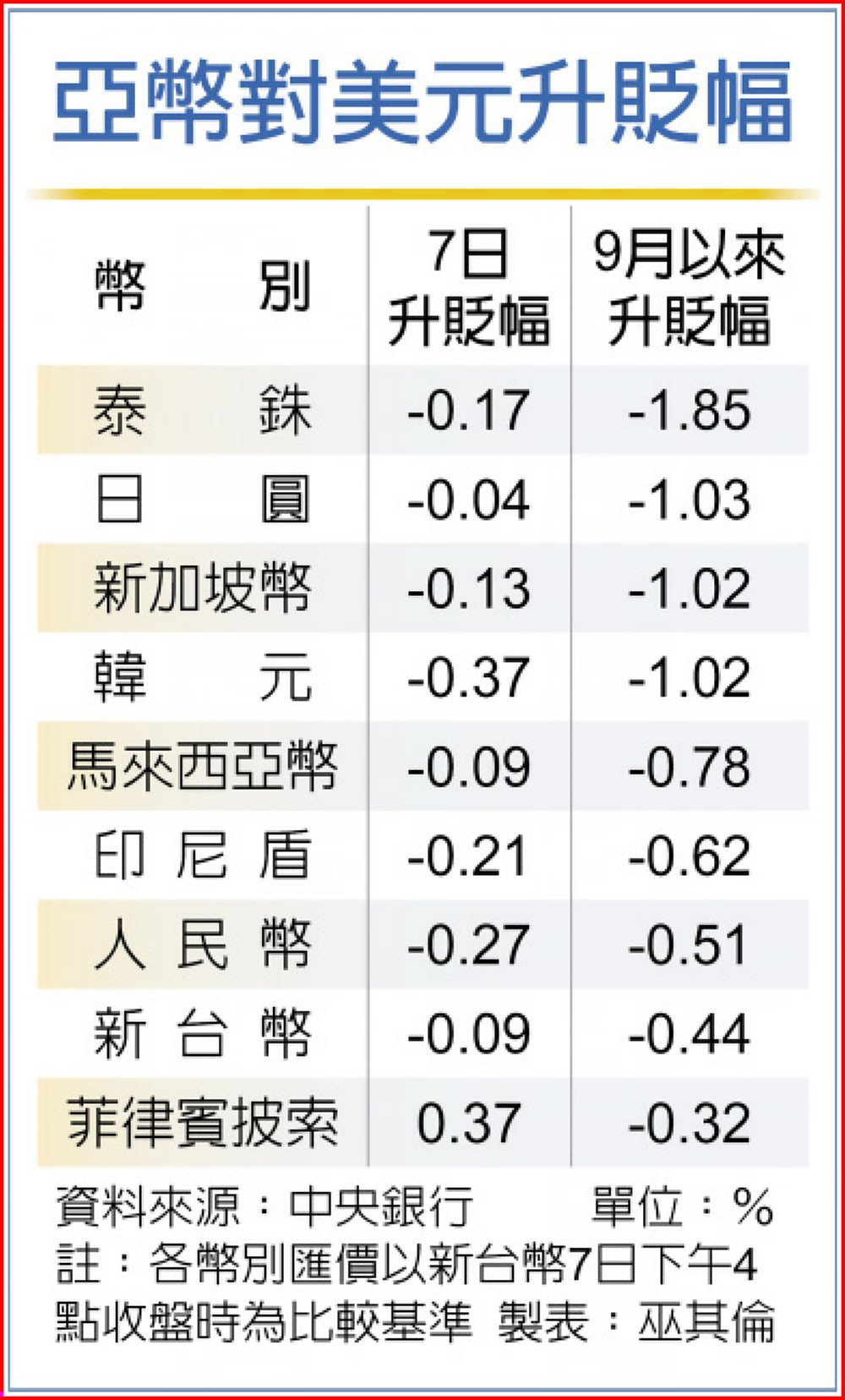 美元對主要貨幣的美元指數7日升值0.05%至104.91。前一日甫衝上105.03的六個月高點。美元指數維持強勢,人民幣兌美元在岸價7日急挫,終場收跌195個基本點報7.3279元,創近16年新低。市場認為,外部情勢仍對人民幣不利,短線尚未看到止跌跡象。