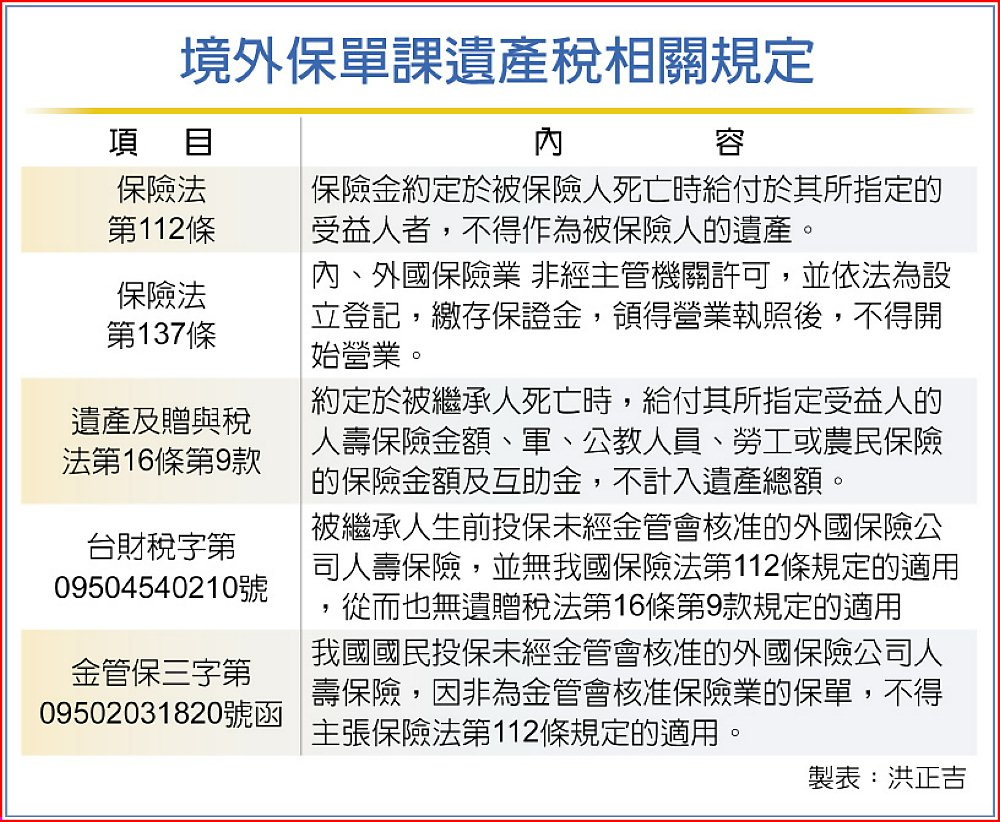 從而,只要不是依我國保險法規定訂立的人壽保險契約,就沒有保險法第112條規定的適用,也無從依遺贈稅法第16條第9款,主張境外保單的保險金不計入遺產總額。