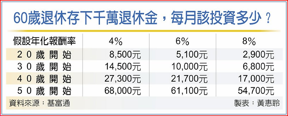 退休理財金額不用多,如果及早開始,每月只要3,000元,藉由定期定額紀律投資,發揮積少成多的複利效果。舉例來說,20歲開始、假設年化報酬率6%,60歲退休時的帳戶價值有機會達600萬元;若是30歲才開始存錢,每月存1萬元,假設年化報酬率6%,60歲退休時即有千萬元另一筆自存的退休金。