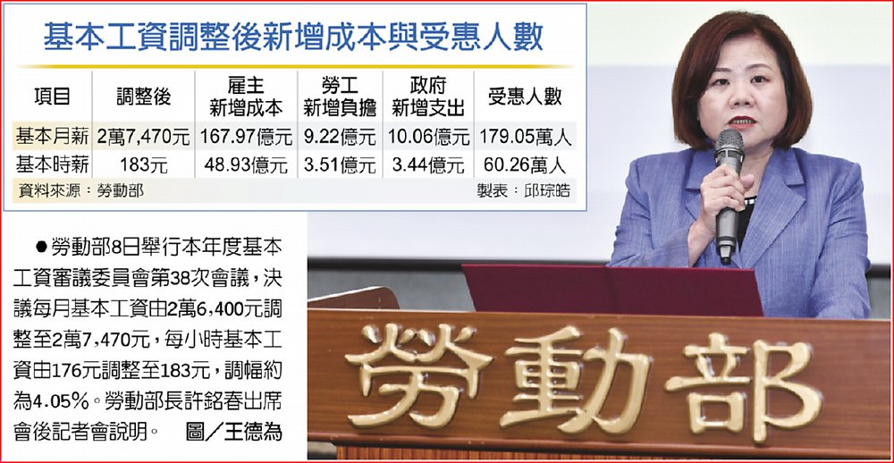 基本工資調整後新增成本與受惠人數 ●勞動部8日舉行本年度基本工資審議委員會第38次會議,決議每月基本工資由2萬6,400元調整至2萬7,470元,每小時基本工資由176元調整至183元,調幅約為4.05%。勞動部長許銘春出席會後記者會說明。圖/王德為