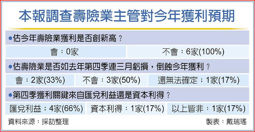 今年第四季是否有可能再次發生連月大虧的情況?壽險主管看法不同,有三家認為不會,有二家認為可能再發生,有一家認為目前還無法下定論。