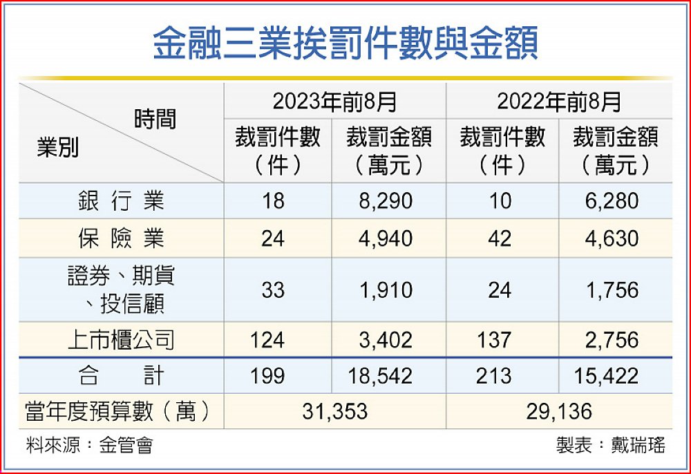 根據金管會三大業務局前八月開罰金額,銀行局罰單共18張、金額8,290萬元,較去年同期的10張、6,280萬元,年增逾2,000萬元、32%。銀行局副局長林志吉表示,前八月裁罰金額較多,主要是8月10日一家金控與銀行違反公司治理的重大裁罰,開罰達3,000萬元,另5月30日該銀行因行員涉及協助詐騙集團,開罰2,000萬元,7月27日也對該家銀行因理專挪用客戶款項,開罰1,000萬元,等於對該家金控與銀行累積開罰6,000萬元。