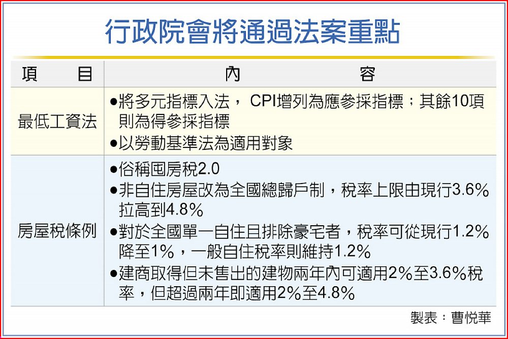 行政院會這次罕見一次通過高達八個修正草案,其中又以《最低工資法》和《房屋稅條例》最受關注。行政院日前核定明年基本工資連續八次調漲,月薪調升至2萬7,470元、時薪183元時,行政院長陳建仁就指示儘速擬定《最低工資法》草案。