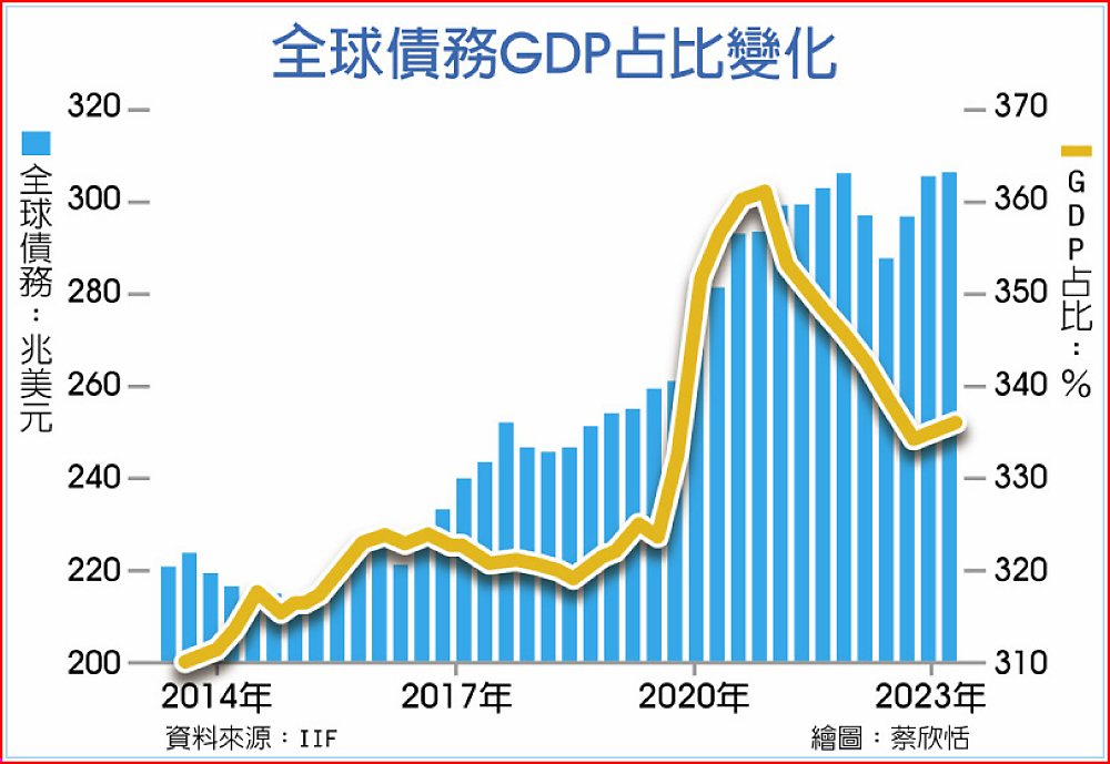 IIF最新報告顯示,高利率環境造成全球負債金額飆高,目前的負債規模較十年前暴增100兆美元。