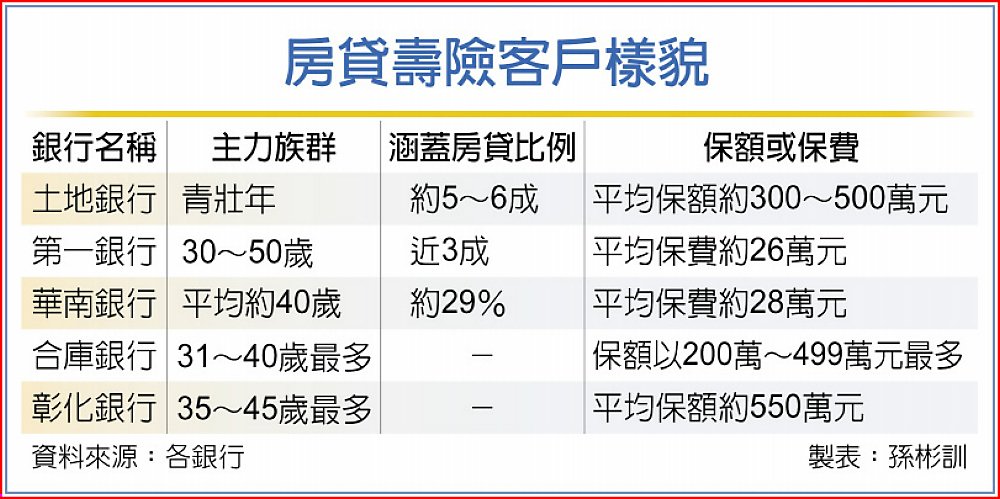 房貸龍頭土地銀行房貸壽險平均保額約300~500萬元,涵蓋房貸金額比重約5~6成左右,購買族群以青壯年為大宗。