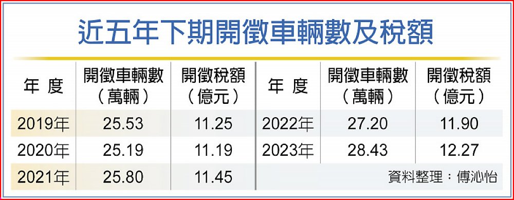 財政部統計,112年營業用車輛下期使用牌照稅開徵車輛,比111年增加1萬2,3515輛、年增4.53%;稅額則增加0.37億元、年增3.07%,主要是疫後國內旅遊興盛,租賃用車需求大增,相關車輛領牌數增加。
