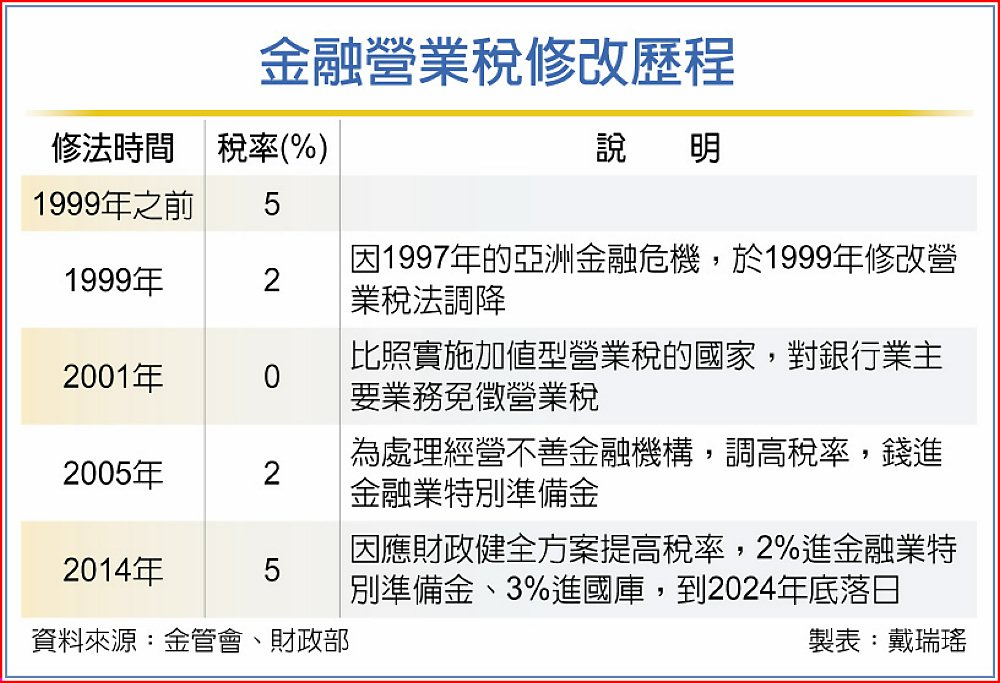 金融營業稅在2001年時曾降為0%,當初是考量金融業沒有進項稅額可扣抵,稅負相對較一般產業重,因此比照大多數實施加值稅國家對金融業免徵營業稅,但2005年為充實「金融重建基金」,將稅率調升為2%。2014年以挹注國家稅收為由,再調升稅率至5%,其中2%是進到金融業特別準備金、3%進入國庫,從2015年6月實施至今,預計到2024年底落日。