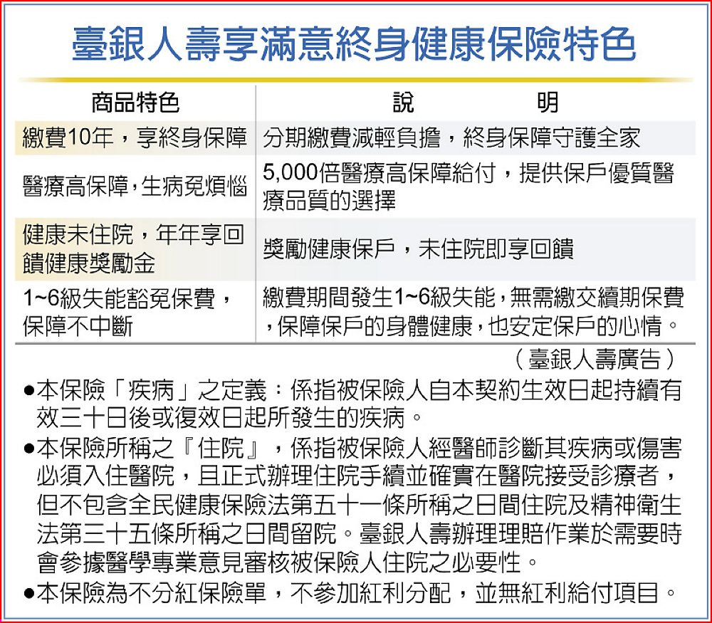 唯一國營的臺銀人壽推出針對民眾就診與醫療需求的享滿意終身健康保險,設計「繳費10年,享終身保障」、「5,000倍醫療高保障,生病免煩惱」、「健康未住院,年年享回饋健康獎勵金」以及「1~6級失能豁免保費,保障不中斷」四大特色。