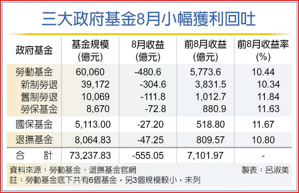 勞動基金運用局統計,整體勞動基金截至8月底止,截至8月底評價後收益數為5,773.6億元,收益率10.44%,8月單月獲利回吐480.6億元。若加計受託管理的國保年金及農退基金,到8月底止,總管理規模達6兆5,293億元,收益率為10.53%。