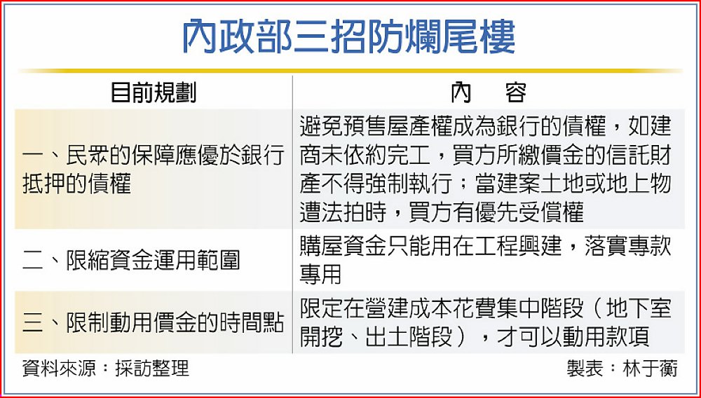 內政部強調,這部分要「實質」管控預售動支款,排除灰色地帶,落實專款專用。