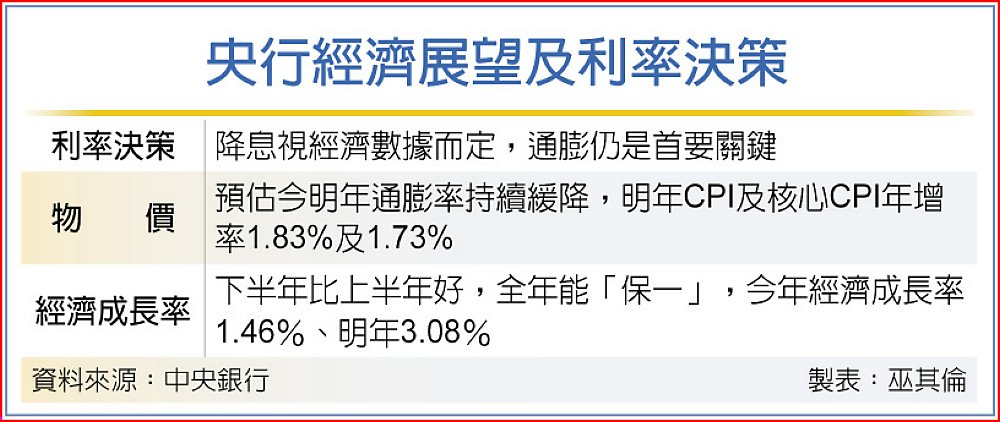 楊金龍指出,美國將維持高利率一段時間,主要也是看通膨下來速度如何,若下降很緩慢,高利率維持期間就會拉長,國內是否降息,要看經濟預測,預測明年通膨率不會超過2%,「還是要看這些數字」,即通膨仍是最重要的關鍵。